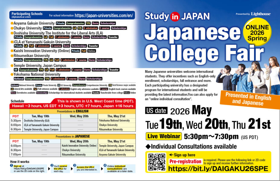 Online (livestream)The Lighthouse will host the online free event, “Japan University Online Fair”. This event is open to anyone interested, including students, parents, and educators. Eight universities are scheduled to participate, […]