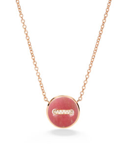 ネックレスに関しては、「ポムポムドット」コレクションであろうピンク色のペンダント。1974年以来ポメラートのアイコン的なデザインと公式ウェブサイトには載っているが、2024年にリバイバルされたバージョンしか知らないので、最初に見た時はディズニーキャラクターのベイマックスかと思った。もちろんそんな訳はなく、ボタンをイメージしたローズゴールドの円形モチーフとなっている。石川選手のものはピンク色のチューライト(桃簾石)で、中央の一文字の糸を表す部分は小さなダイヤモンドがパヴェ状(小さなダイヤモンドを石畳のように隙間なく敷き詰める技法)に配されている。このペンダントはリバーシブルで、反対側はマザーオブパールで糸部分はゴールドのみとなっており、どちらのサイドにするかで違った表情を見せる。
