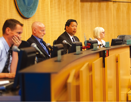 インターナショナル・ディストリクトでのMHA制定を決議する市議会 と、そこで意見陳述をするレスリーさん。「移住直後で生活基盤が乏しいマ イノリティー移民を受け入れ続けてきたのがインターナショナル・ディストリクトです」と、地区の歴史と文化への理解を市議へ訴えた
