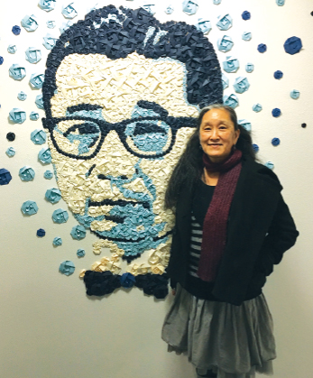 ヒラバヤシ・プレース内、日系人の歴史展示スペースにあ る、レスリーさんの娘さんが折り紙で創作したゴードン・ヒ ラバヤシ氏の肖像アートの前にて