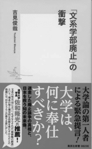 『「文系学部廃止」 の衝撃』(吉見俊哉著、集英社新書)(写真)は、東京大学教授で同大学の副学長も務めた著者によるもの。2015年6 月に文科省が出した「国立大学法人等の組織及び業務全般の見直しについて」という「通知」を機に、突如として世論を賑わした「文系学部廃止」論争について扱う。
