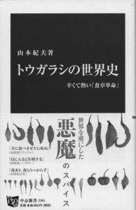 『トウガラシの世界史/ 辛くて熱い「食卓革命」』(山本紀夫著、中公新書) (写真)は、植物学者による、トウガラシの魅力と役割に注目した珍しい一冊。トウガラシは15 世紀末、コロンブスによって原産地の中南米からヨーロッパに持ち帰られ、ヨーロッパからアフリカやアジアなど世界各国にもたらされた。今や中南米原産とは想像できないほど、500年ほどの期間に世界中で利用・栽培され、食文化に欠かせないものとなっている。朝鮮半島にトウガラシが伝わり、キムチにトウガラシが使われるようになったのは今から250年ほど前のことでしかない、というのは驚きだ。