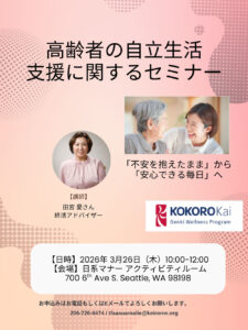 シアトルのサービス付き高齢者向け住宅、日系マナーが、高齢者の生活上の困りごとをテーマにセミナーを開催。THT Harmonyの終活アドバイザー、田宮愛さんを迎え、「安心して過ごせる毎日」を送るための情報を紹介する。日常生活の不安や病気、介護への備えについて考える機会となる。