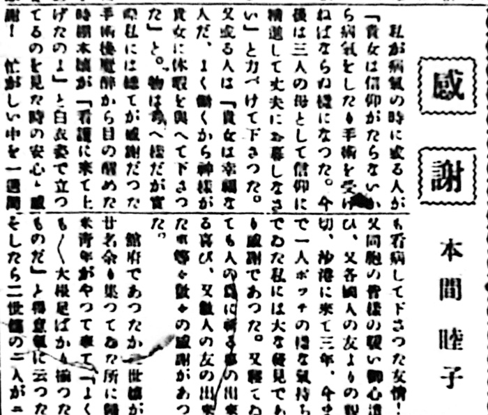 本間睦子氏は1949年1月1日号北米報知社の社員一覧の社友として掲載されている人物。