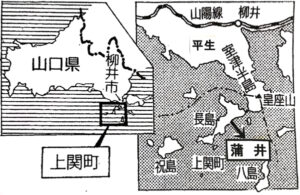 山口県の南東部にある上関町は、室津半島の室津、長島にある上関、戸津、蒲井、白井田、四代、祝島、八島からなる。1888年に市制・町村制が交付された時には室津村と長島・祝島・八島の三島からなる上関村があった。1889年の室津村の人口は、男1660人、女1640人。上関村は男4062人、女3878人であった。